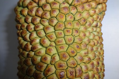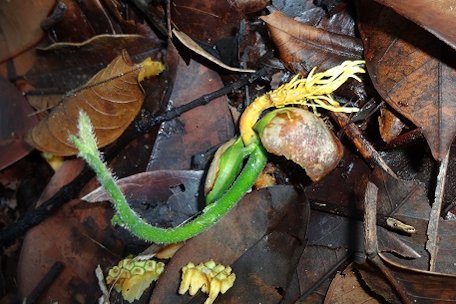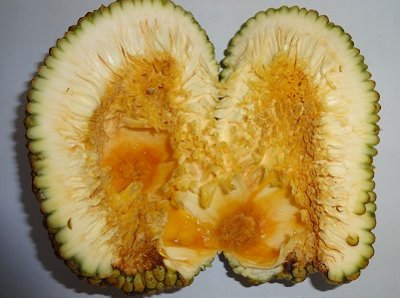 Fig. 13. The germinating seeds with the roots that appear to be yellow in colour Fruit The green, yellow or orangish brown skin is divided into small hexagons and either smooth or covered with small protrusions. It is cylindrical in shape, 10-17.7 in. (25-45 cm) long by 4-6 in. (10-15 cm) across, 2.2-13 pds (1-6 kg) in weight. Like the jackfruit, it is a syncarp, composed of fleshy arils or segments, 1.2-1.8 in. (30-45 mm) across, colored pale yellow, yellow, orange or green. Each aril surrounds a seed. Texture is firm, somewhat fibrous, sweet and rich. Compared with jackfruit, chempedak is sweeter and has less acidity. Unlike jackfruit seeds, they have a thin, edible seedcoat. 6 The total edible portion (perianths + seeds) is 25-50% of fresh fruit weight. The total weight of all perianths of a fresh fruit varies from 0.3-2.6 pds (100-1200 g). 4 The rind is thinner than that of the jackfruit and the seeds and surrounding pulp can be extracted by cutting open the base and pulling on the fruit stalk. 11 Maturation time is 3-6 months, depending on genotype and climate. 3
