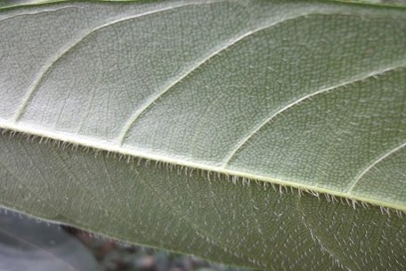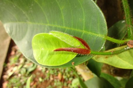 Fig. 6. Occasionaly lobed in very young plants Fig. 7. Margins are entire Fig. 8. The lateral veins are in 6-10 pairs curving forward Fig. 9. Close-up of the dorsal view showing the hairs Fig. 10,11. New shoot covered in thin, wiry brown hairs Flowers The inflorescences are solitary and borne on the axillary position of short leafy shoots. Male heads are cylindrical, 1.2-2.2 x 0.4 in. (3-5.5 × 1 cm) in size, and are whitish-yellow in colour with 3-6 cm long peduncle. The female heads occur with simple filiform styles exserted to 0.06 in. (1.5 mm). 6 Flowers may be found at any time of year, but bloom is concentrated around one period of the year. 3 The growth of the fruits is most rapid during the first weeks following stigma emergence. Stigmas remain receptive for 1-2 weeks. 4 Pollination Whereas the female flower heads are only found on cauliflorous shoots, most male heads are formed on shoots in the periphery of the canopy. This may facilitate pollination by wind, although the pollen is sticky. Insects visit the scented male inflorescences, not the female ones which lack nectar. 4
