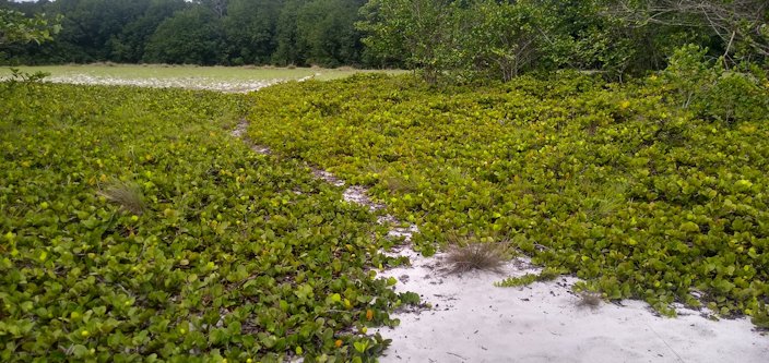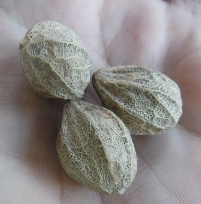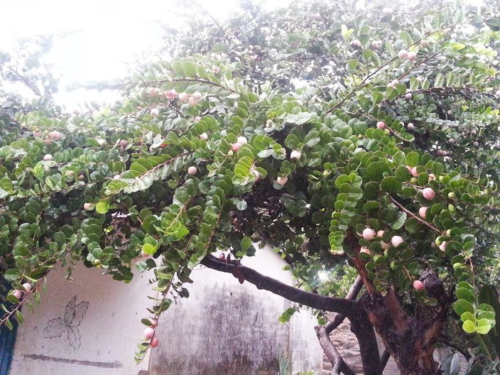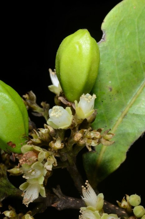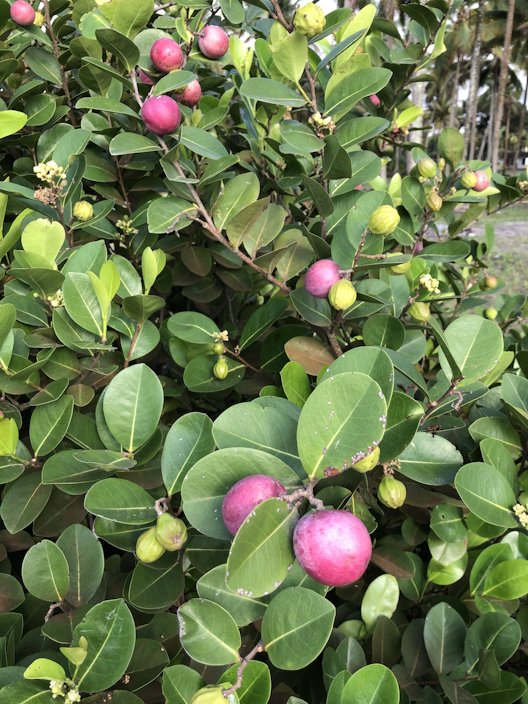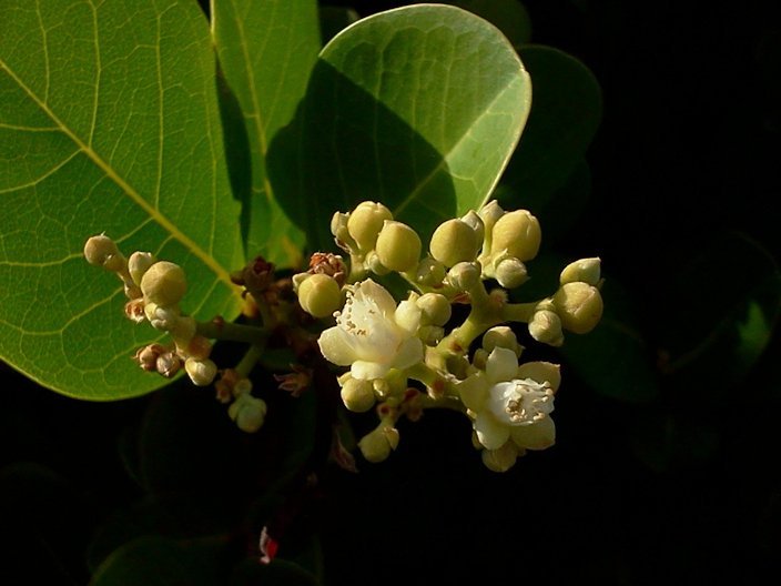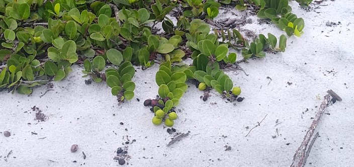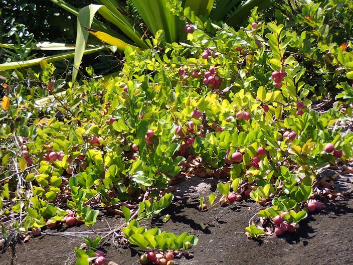 Fig. 29. C. icaco, Sint Maarten, Caribbean (unripe fruit) Fig. 30. C. icaco (Cocoplum), Municipio de Tulum, Q.R., México Fig. 31. C. icaco, Jupiter, FL 33478, USA Fig. 32. C. icaco (Cocoplum), Gaspar Hernandez, Dominican Republic Varieties 'Horizontal' is the cultivar synonymous with the coastal form of cocoplum. Its new leaves are light-green to yellow-green, and mature fruit are predominantly white, white blushed with pink, or (less often) purple. 1 'Red Tip' is a cultivar of the inland form of cocoplum. The color of the new leaf growth is burgundy-red, becoming yellowish-green and then dark-green. The mature fruit color is usually purple. 1 'Green Tip' have light-green new leaves that become dark-green. Mature fruit color is predominantly white and often blushed with pink. 1 Harvesting Fruit production peaks from May through August, although some plants fruit sporadically throughout the year. 2 Immature fruit are green and become purple, white, or white-blushed pink when mature. They do not ripen when picked prematurely. Mature fruit easily detach from the stem and fall below the plant or are removed by people or wildlife. 1 Propagation Cocoplum is usually propagated by stem cuttings. This ensures that the new plants will be of the same ecotype or cultivar as the parent. You can also propagate cocoplum by seed but the results are mixed. The offspring might not be "true to type" (identical to the parents) and the process is slower. 4 Cuttings will root quicker if started in the spring from non-flowering and non-fruiting stems. 1 Planting Both ecotypes and all cultivars can be cultivated on both coastal and inland sites. Soil tests done by Lee County Extension have found naturally occurring cocoplum growing in soil with a pH range of 6.6 to 8.4. Established plants have a high flooding tolerance, and many grow along fresh water canals and in soils seasonally inundated for several weeks by fresh water. 1 Pruning Required to maintain each ecotype to the height desired, as a hedge or groundcover. Fertilizing Cocoplum's nutritional requirement is low. However, young plants grow faster with adequate fertilization. Once a plant reaches four or more feet tall in a hedge row of the inland ecotype, fertilization is rarely (if ever) needed. 1 Pests Lobate lac scales (Paratachdina pseudolobata) and the accompanying sooty mold deposits on leaves and stem are sometime seen. The little leaf notcher (Artipus floridanus) makes shallow notches along the leaf blades sometimes so uniform that they appear to be natural leaf serration rather than feeding damage. The Sri Lanka weevil (Myllocerus undecimpustulatus undatus) chews both shallow and deep notches along the leaf margins. The feeding pattern is very noticeable. 1 Diseases Algal leaf spot (Cephaleuros virescens) and Botryosphaeria (Botryosphaeria sp.) canker and blight may occur. 1 Food Uses The sweet fresh fruits, although somewhat insipid, are eaten out of hand. They do sometimes cause an astringent taste in the mouth. The fruits are commonly stewed with sugar or made into jam. They were one of the most important fruits used by early European settlers in coastal areas of Florida. In Cuba the boiled fruits are made into a sweet preserve and eaten as dessert. The seeds can be roasted as nuts. 9 The seeds are about the size of a pistachio and taste like a roasted almond. 11 The large kernel removed from its shell is edible raw or cooked. Some think it has the faint flavor of almond. To me it tastes like granola. Green Deane. 12 Nutrient Content A 100 g fruit portion contains 86.3 g water, 47 kcal, 0.4 g protein, 0.1 g lipid, 12.4 g carbohydrate, 1 g fibre, 0.8 g ash, 38 mg calcium, 0.6 mg iron, 17 mg phosphorus, 9 mg ascorbic acid, 0.04 mg thiamine, 0.03 mg riboflavin, 0.3 mg niacin, trace vitamin A. 8 Medicinal Properties ** The root, bark, fruit and leaves all contain tannins and are astringent. They are used internally in the treatment of diarrhoea, dysentery and dyspepsia. They are used externally as a wash to treat skin complaints. 7 Other Uses The plant often forms large, rambling, impenetrable thickets and so it has been used to stabilize sand dunes. 7 The oil in the kernel can be substituted for almond oil. The seed is about 21% oil by weight. In fact, the seeds can be strung on sticks and burned like a candle. 12 The oil can also be used to make candles, soap, and axle grease. The kernels (and leaves) can also be used to make a black dye that helps fibers resist decay. 12 General Provides significant food and cover for wildlife. Flowers attract butterflies, bees, beetles, and wasp pollinators. Squirrels eat the fruit. While the fruits are too large for most birds, cardinals, grackles, jays and red-bellied woodpeckers eat them in bites. They host a wide variety of insects that, in turn, provide food for insect-eating birds. 10