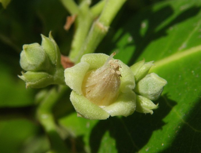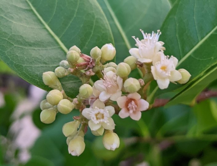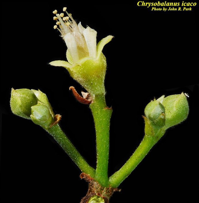 Fig. 10,11. C. icaco (Cocoplum), Naples, FL 34110, USA Fig. 12. C. icaco (Cocoplum), Fern Forest Nature Center, Coconut Creek, FL, US Fig. 13. C. icaco (Cocoplum), Okeeheelee Park, West Palm Beach, FL, US Fig. 14. 'Red Tip' cocoplum, Puerto Rico, Caguas, PR, US Fig. 15. C. icaco (Cocoplum), young red leaves, Holiday Inn Express Boynton Beach, Florida Flowers Flowering is mostly from January to August, but the main flowering period is usually late spring. The flowers occur in rather inconspicuous, short, axillary, and terminal clusters called cymules (few-flowered, poorly branched inflorescences in which the central flower matures first). Each flower is perfect (with both male and female sexual organs). 1