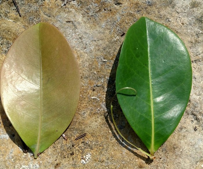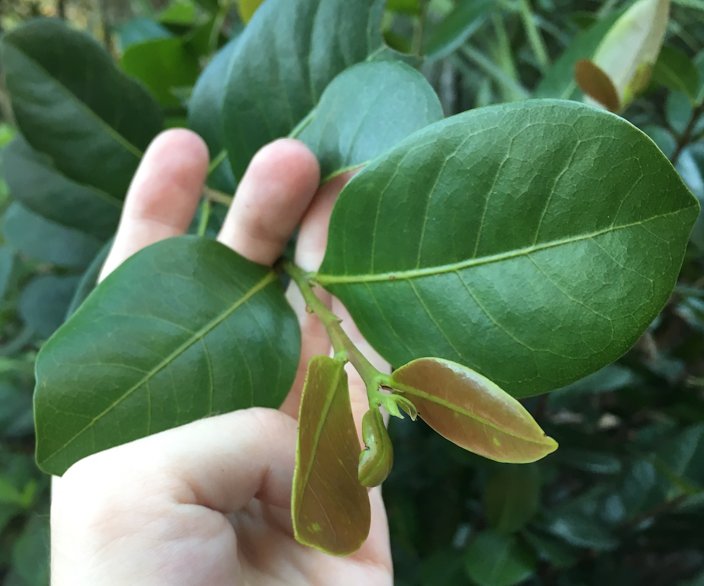 Fig. 5. C. icaco (Cocoplum), Etimboue, Gabon (coastal ecotype) Fig. 6. C. icaco (inland ecotype) Leaves The twigs are green and hairless when young and turn reddish brown with raised lenticels at maturity. The branches have two rows of shiny, dark-green, leathery, round or elliptic, alternate leaves 1-4 in. (3–10 cm) long by 1-2.75 in. (2.5–7 cm) broad, on a 0.1 in. (3 mm) petiole. The undersurfaces are light green. The simple leaves turn upward. 8 New leaves are coppery-pink in color and some, notably ‘Red Tip” have reddish new leaves. 3