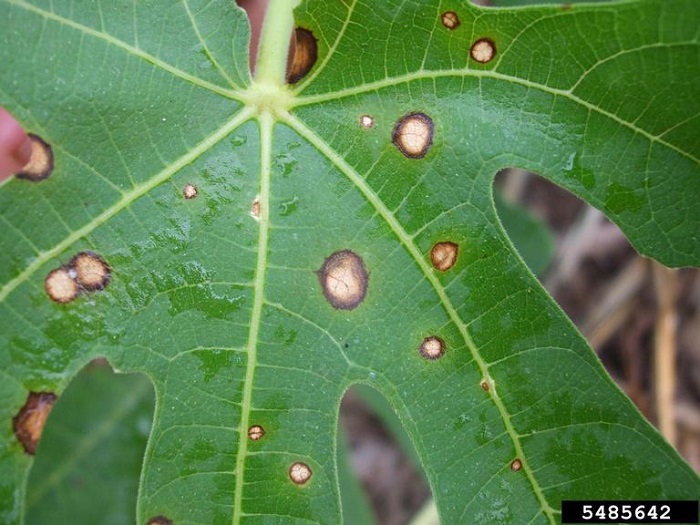 to Fig Page ![]() Fig. 1 ![]() Fig rust, fruit symptoms ![]() Fig. 2 ![]() Pustules of fig rust on the lower leaf surface ![]() Fig. 6 ![]() Cercospora leaf spot (Cercospora fici). Symptoms on Ficus carica.