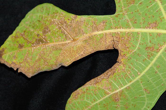 fruit cultivars with an open eye. 1 Fig Rust Caused by Cerotelium fici The most common disease of fig in the southeastern United States is the fig rust (Cerotelium fici). Fig rust turn leaves brown, can cause defoliation and premature ripening of the fruit, and decreases cold tolerance. This disease can be controlled by a 5-5-50 Bordeaux spray (copper sulfate, lime and water) applied every two to three weeks during the growing season, from April to November. 1