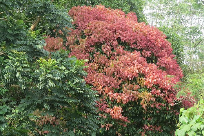 Fig. 26. Young tree Fig. 27. Longan 'Kohala' Fig. 28. D. longan (Longan, dragon's eye) habit at Wailuku, Maui, Hawai'i Fig. 29. Base of an old tree Thinning Longan fruit set varies greatly among trees and years. In some years, individual longan panicles set in excess of 300 fruit. However, panicles with 150 or more fruit usually produce small fruit. Removing about 50% of the set fruit during the spring usually results in a large increase in fruit size. Thinning is best done when fruit are 1/4 to 1/2 inches (6-12 mm) in diameter and consists of removing one half to two-thirds of the distal (terminal) end of each panicle. 1
