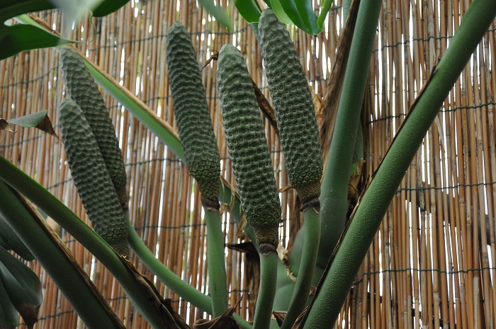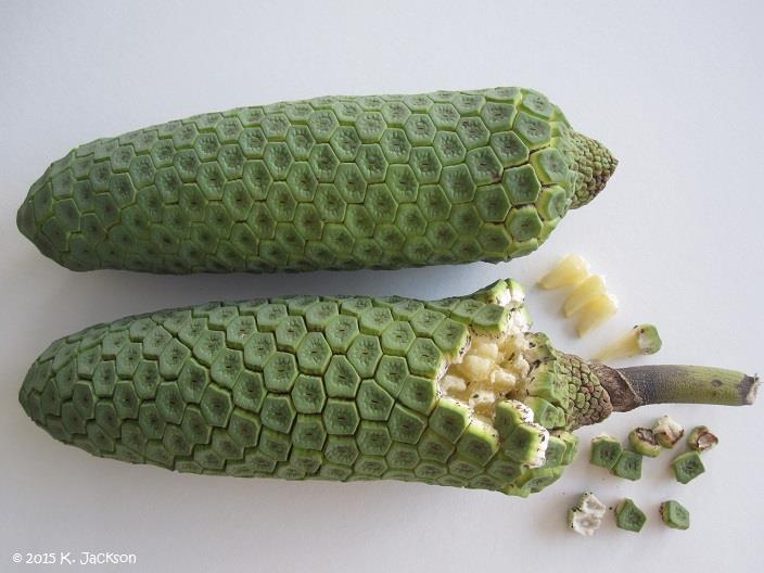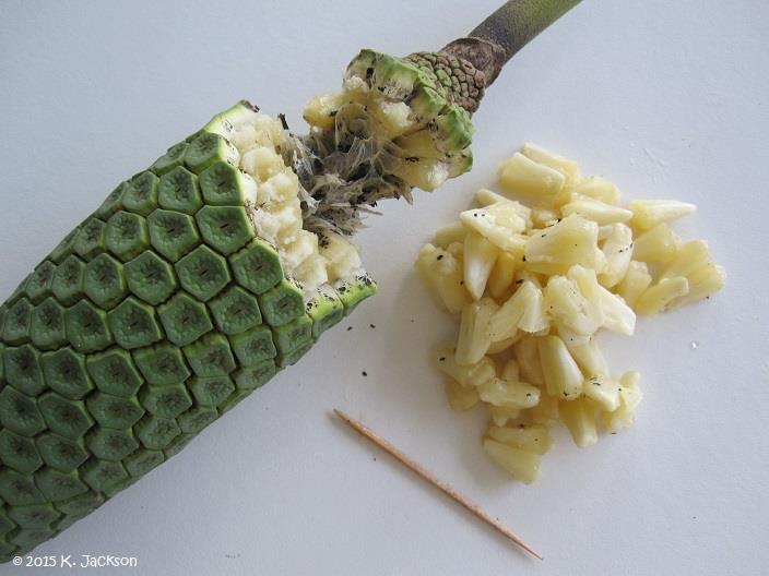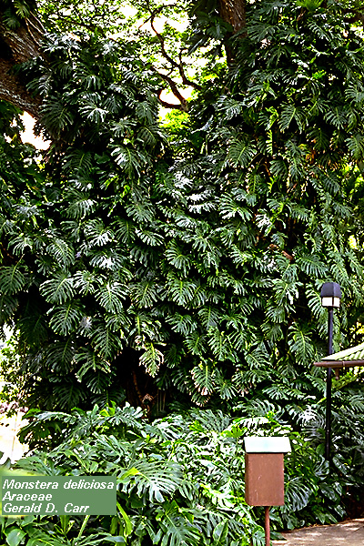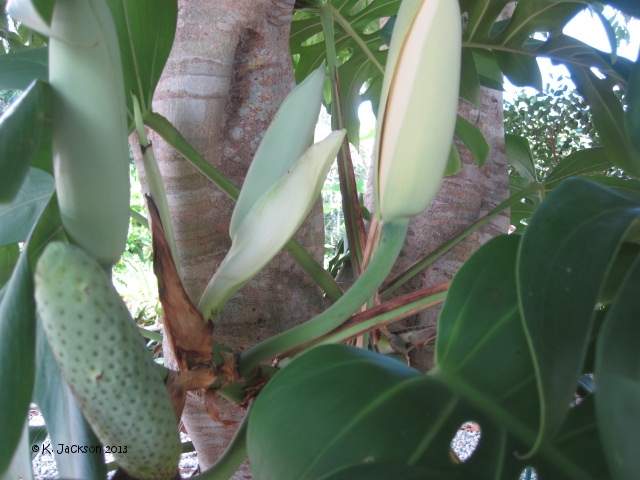 Fig. 9. Philodendron species can be found in many diverse habitats in the tropical Americas and the West Indies Fig. 10. M. deliciosa (Swiss-cheese plant). Habit and water feature. Iao Tropical Gardens of Maui, Maui, Hawai'i Flowers The bloom of Split-Leaf Philodendron is a 12-inch-long, white, calla-like spadix and it is sometimes followed by the unusual, edible fruit which tastes much like a cross of pineapple and banana. The fruit can take a year or longer to ripen, but only under the exacting conditions of proper warmth, high humidity, and bright light typical of USDA hardiness zone 10. 4 Flowering and fruiting overlap because it requires 12 to 14 months from the opening of the inflorescence to the maturity of the fruit. Therefore, there are often unopened inflorescences, immature fruits and ripening fruits together on the same plant. The current year's crop is ripening through summer and fall while the following year's crop is forming beside it. 1 Fruit The fruit is called a spadix and is made up of numerous cohering berries. At first the spadix is sheltered by a waxy, white, spathe (bract) (Fig. 13) that later drops off. The compound fruit is cylindrical, green, 8 to 14 inches (20-36 cm) long and 2 to 3 1-2 inches (5-9 cm) in diameter. The peel is thick, hard, and made up of hexagonal plates (scales) that cover individual segments of ivory colored, juicy, flavorful pulp. Among the fruit segments are small, black particles which are the remnants of flowers. Generally, there are no seeds, although sometimes small, pale-green seeds are produced. 2 The fruit or Ceriman will grow even without pollination, about 25 cm (10) long. Immature fruit (green) contains calcium oxalate which is toxic. The fruit should not be consumed before maturity (yellow) (Fig. 25).