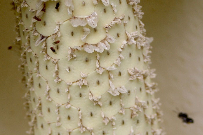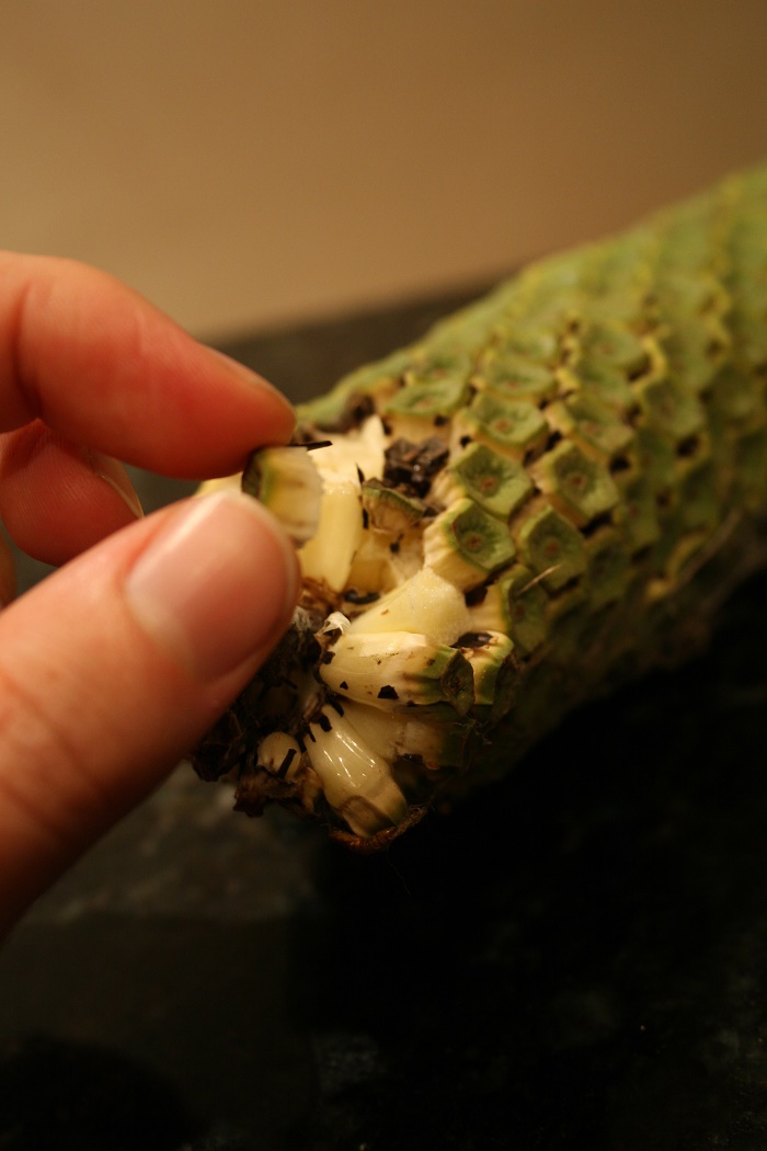 Fig. 21. Different stages of fruiting Fig. 22. Note the dead cataphyll at the leaf petiole, plus the dead spathe around one spadix Fig. 23. Fruiting habit Fig. 24. M. deliciosa. We have a plant in our new house. Didn't know if it was edible at first. Yum. Fig. 25. M. deliciosa: ripened fruits with inside details Close up series of the ceriman fruit