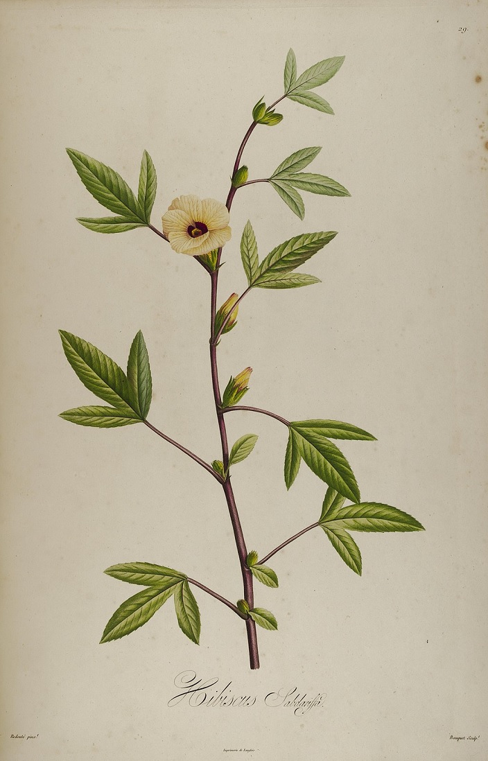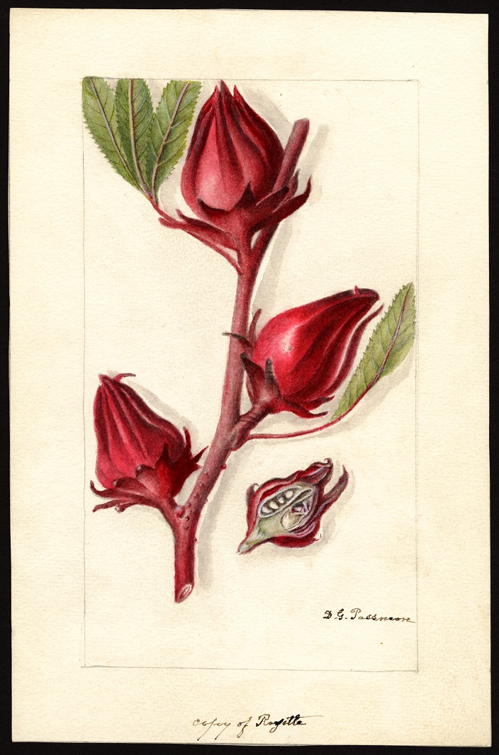 Art Fig. 1 Redouté́, P. J. "Hibiscus sabdariffa." Description des plantes rares cultivées à Malmaison et à Navarre, t. 29, Missouri Botanical Garden, St. Louis, U.S.A.,1831, Plant Illustrations, Public domain, plantillustrations.org/illustration.php?id_illustration=57591. Accessed 16 Aug. 2019. Fig. 2 Passmore, Deborah Griscom, "Hibiscus sabdariffa: Victor." U.S. Department of Agriculture Pomological Watercolor Collection, Rare and Special Collections, National Agricultural Library, Beltsville, MD 20705, 1906, USDA Pomological Watercolors, Public domain, usdawatercolors.nal.usda.gov/pom/catalog.xhtml?id=POM00007234. Accessed 12 Aug. 2019. Fig. 3 Descourtilz, J. T. "Hibiscus sabdariffa L." Flore médicale des Antilles, vol. 1: t. 31, Missouri Botanical Garden, St. Louis, U.S.A., 1821, Plant Illustrations, Public domain, plantillustrations.org/illustration.php?id_illustration=77194. Accessed 14 Nov.2019. Published 15 Nov. 2019 KJ | |